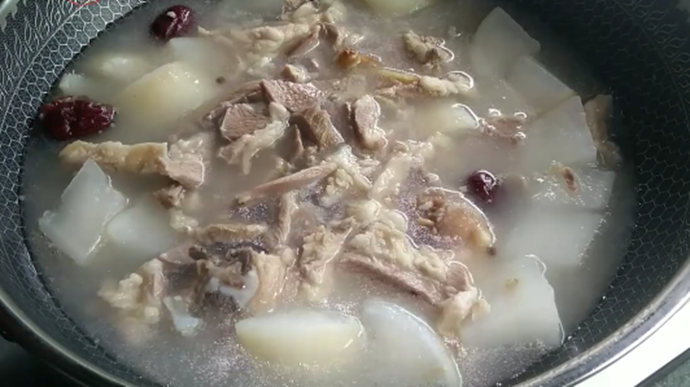 6.炖煮时间到后我们就先把羊肉捞出来,接着下入我们切好的白萝卜,再放上几颗大枣,盖上锅盖炖半个小时。