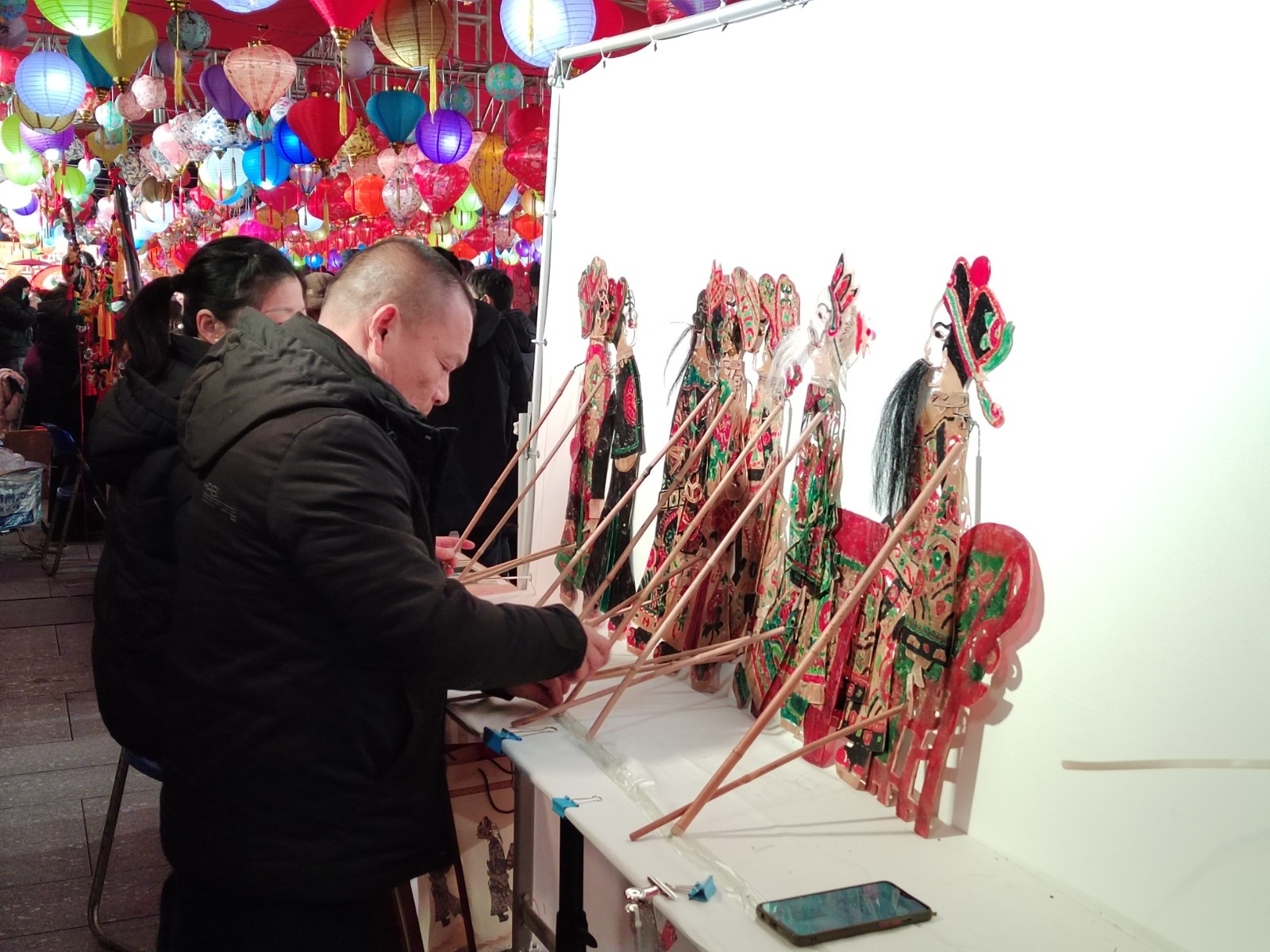 江汉平原皮影戏,演得生龙活虎。花灯映照下,共推出15个极具荆楚特色的年俗表演和展示互动项目,人们逛吃、赏玩、体验不停。在鄂州剪纸、潜江面塑、天门糖塑等展位前,人们专注于传承人现场巧手制作;在糖画展位前,小孩子们面对可爱的兔子糖画垂涎欲滴;在皮影戏展位前,只见皮影子上下翻飞、腾挪跌宕,吸引孩子目不转睛地观看,表演结束大家纷纷鼓掌叫好。打糍粑、包香包、剪纸花等等,唤起了人们对传统民俗的美好记忆。在扬子江糕点展位前,人们揉制并现场品尝汤圆,吃着热腾腾的汤圆,感觉日子更加幸福甜蜜。湖北省群艺馆胡彧老师带来的团扇制作,也是深受大家喜爱的研学项目。在老师的细心指导下,人们运用国画手法,通过笔墨的浓淡晕染,绘就了一幅幅极具中国风的团扇。