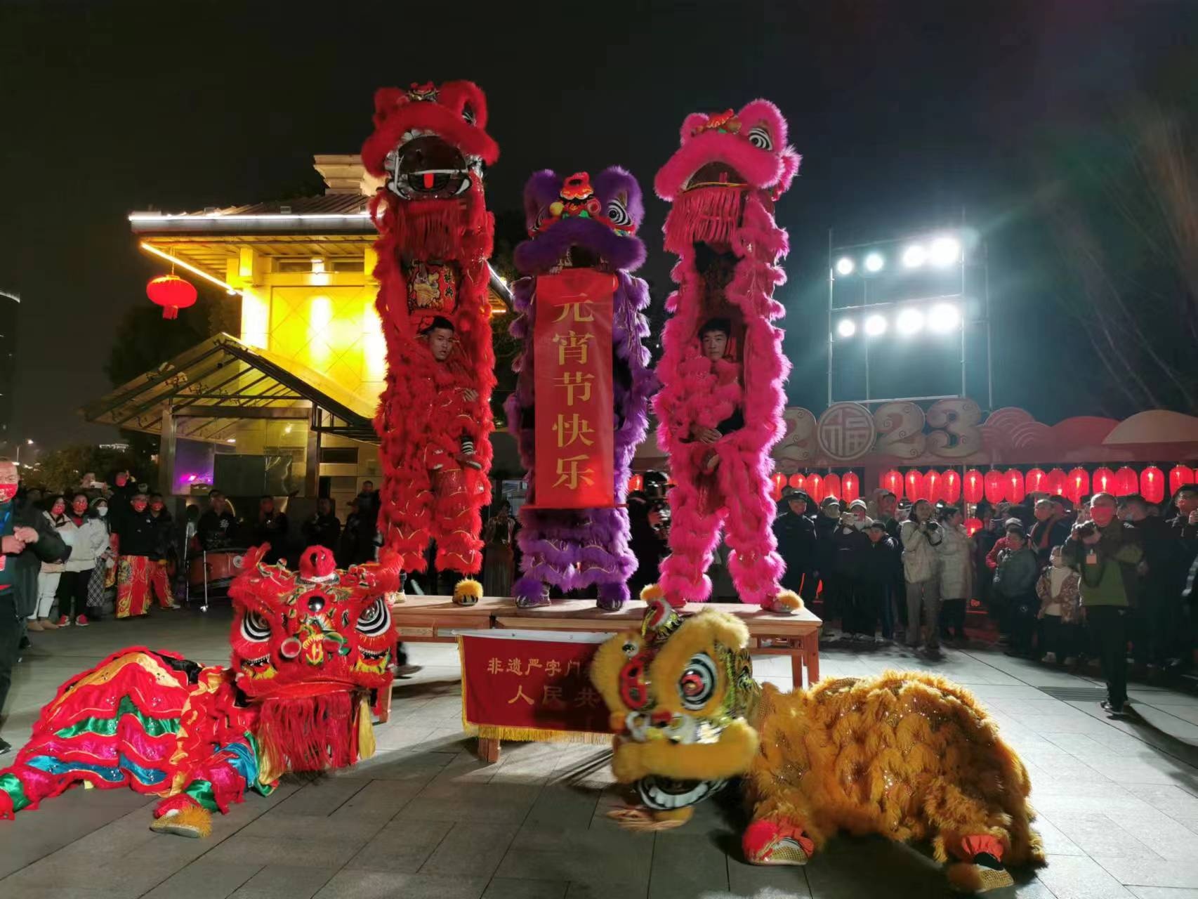 活动现场,流光溢彩,人潮涌动,一片喜庆祥和,满满的人间烟火气,浪漫的元宵醉时光。按照预约通道先后抵达的观众,瞬间就被眼前的场景吸引,恰如穿越了时空,有一种如梦似幻、古今对话之感。主场活动以馆内中轴线延展,依次分为“瑞兽迎宾”、“花灯集市”、“点亮幸福生活”及“夜游博物馆”四个板块。