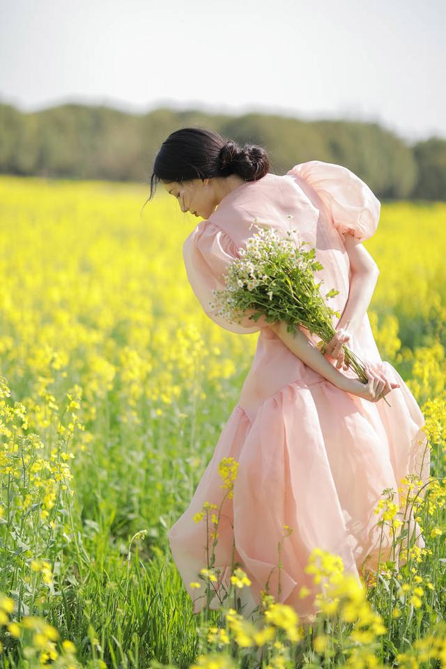 不要再傻傻的站在油菜花田中间啦!蹲下来与油菜花齐平,让它当你的前景,不仅可以丰富画面的层次还可以遮挡你不想露出来的部位。如果实在不愿意面对镜头,那就直接背对镜头摆拍吧!利用成片的油菜花作为拍照的背景,摆拍一个美美的背影照,可以背对镜头双手摆起来拥抱天空,也可以假装往前左右摇摆的走走停停,都能拍出非常有意境的照片。
