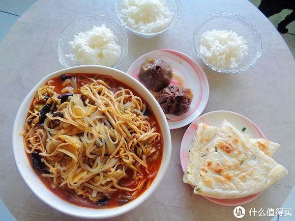 主食:米饭+荞麦面条+豆沙包(早餐剩下)