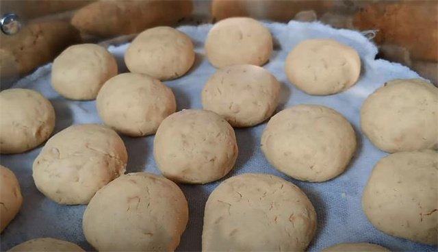 5.时间到,蒸锅上面铺一层笼布,把玉米团依次放入锅中,盖上盖子,冷水上锅,开大火蒸30分钟。