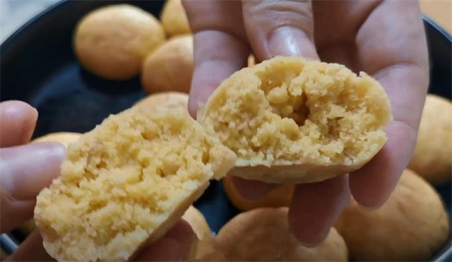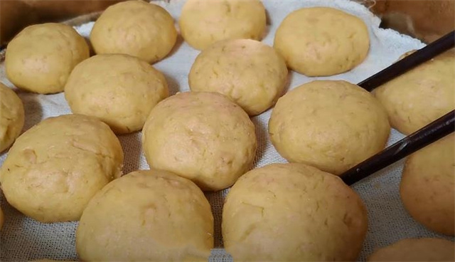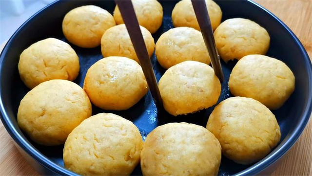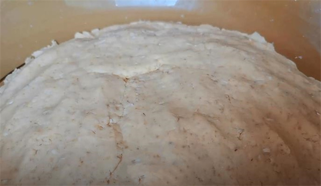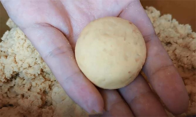 3.玉米面现在已经醒发好了,里面有很多气孔了,然后用手把玉米面团成一个圆球,像这样就可以了。