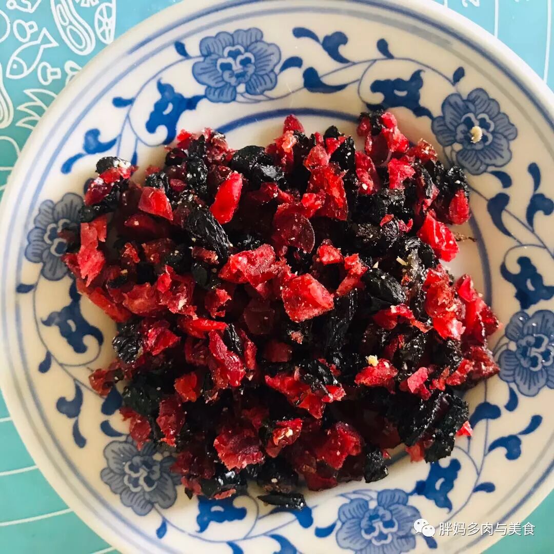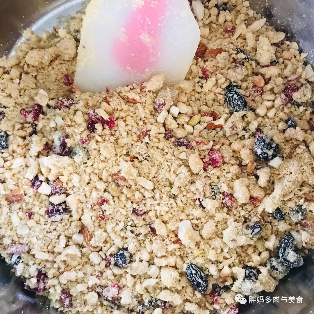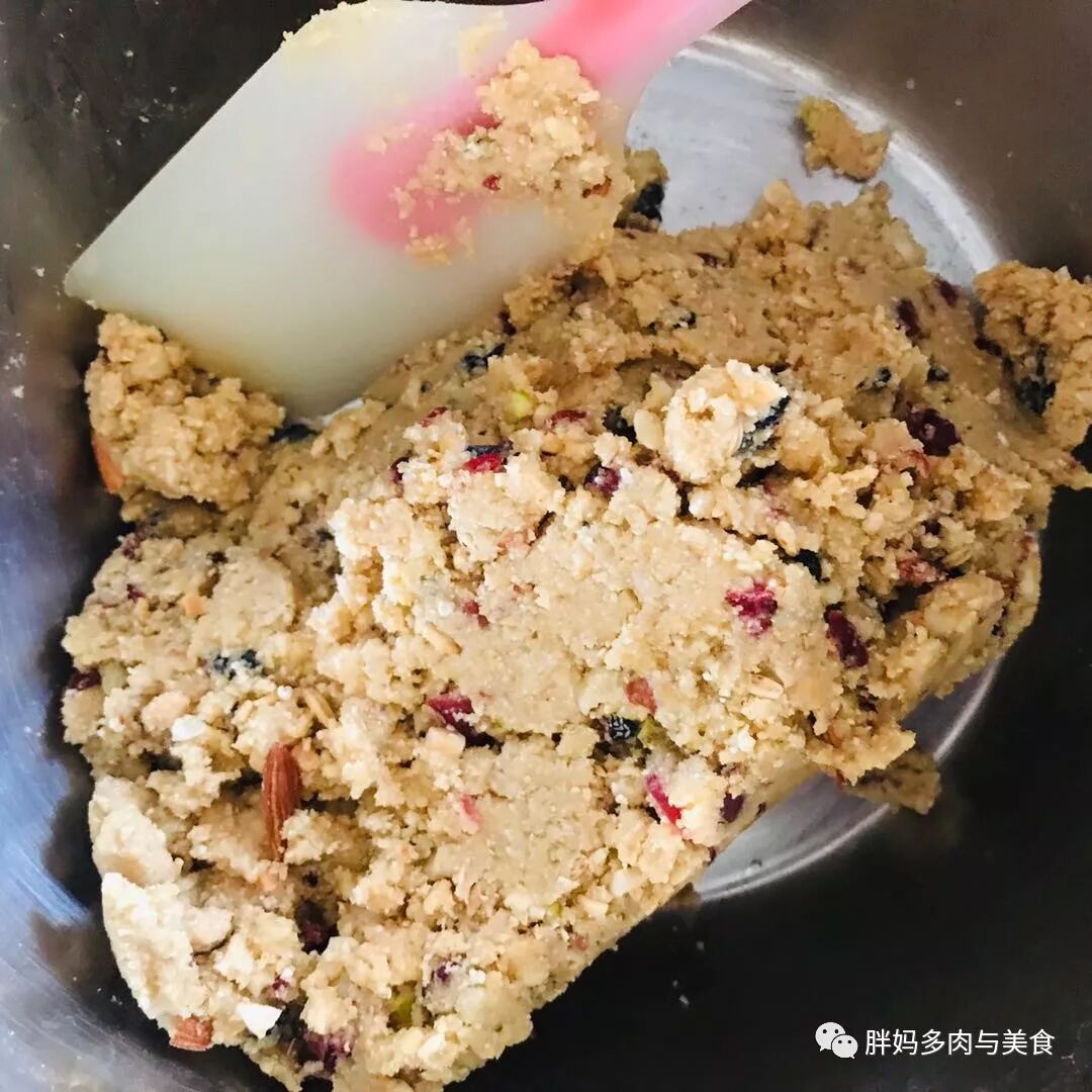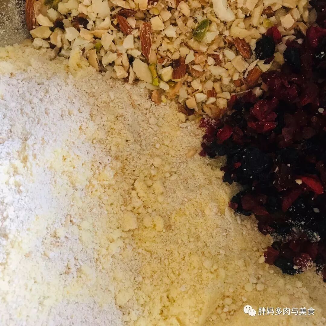 4.将蔓越莓干,葡萄干切碎,与烤好的燕麦,绿豆面(或面粉)核桃碎混合搅拌