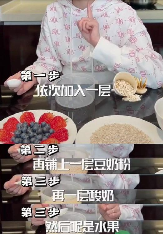 随后颖儿开始向大家分享制作过程,拿出制作豆乳盒子的材料直言到这些材料,家中基本上都有所以制作起来非常的轻松。首先准备一个饭盒然后在底部铺撒一层燕麦,再铺上一层豆奶粉,再一层酸奶然后加入自己喜欢的水果。然后继续按照这个顺序重复2~3片遍饭盒填满,最后冷藏10分钟就可以吃了。
