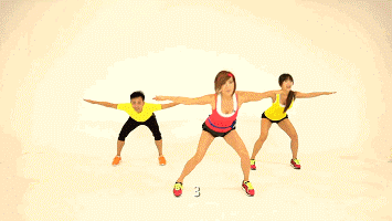 5.双手向上左右摆动,收脚收腹提臀,摆动屁股,要有节奏的左右摆动。每组30秒。