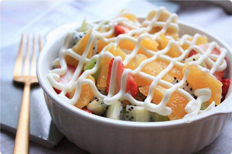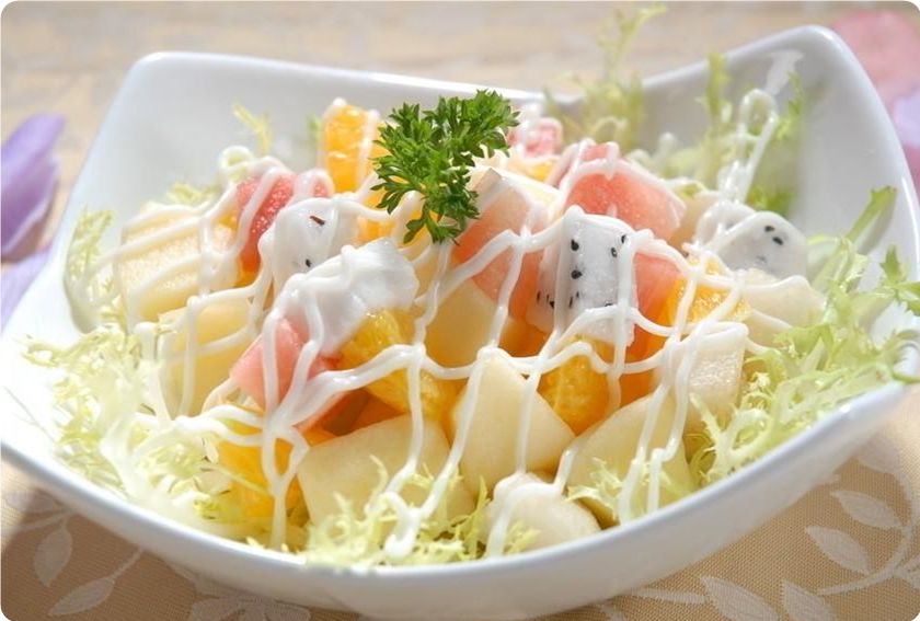 草莓、橙子、奇异果等颜色各异的水果,被切成小块小块地盛放在碗里,上面铺着一层奶白色的网格状的沙拉。看起来多么得诱人、美味,更重要的是看起来“能量低”。是的,它就是被世人捧为减肥佳品的水果沙拉,其中沙拉是减肥的主角。