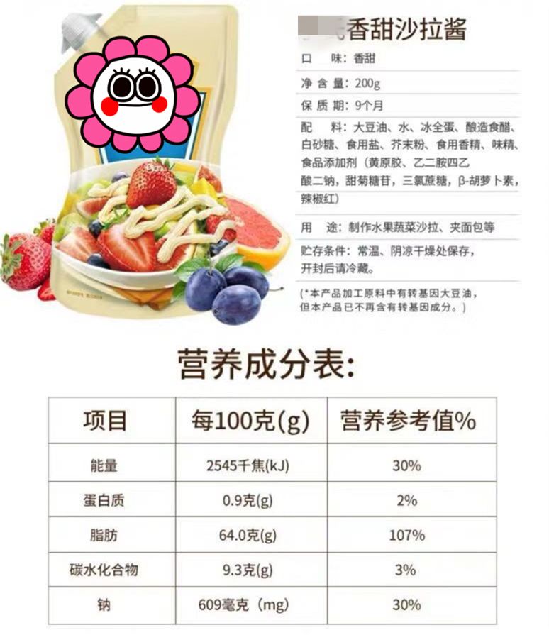 从表中可以看到,能量每100克为2545千焦,按照 1大卡(kcal)=4.1858518千焦(kJ)计算,2545千焦的能量约为608大卡。再看看脂肪含量,每100克沙拉含脂肪64克。608大卡什么概念?我们日常吃的油,就是用来炒菜的那个油,100克能量为900大卡,换言之,一口沙拉半口的油。这里选用的成分表,能量还是比较低的,有的沙拉脂肪含量则去到70%-80%。