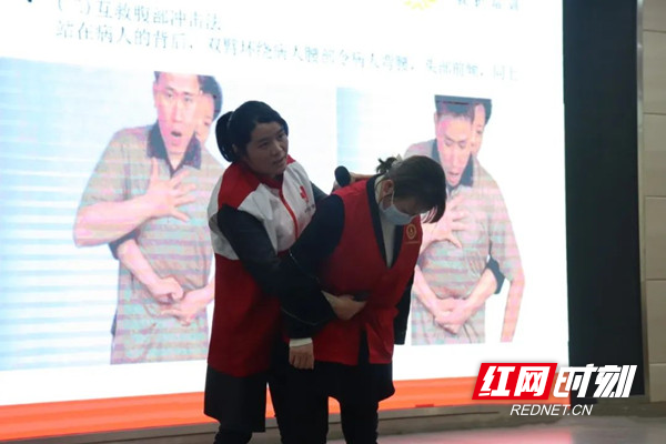 志愿者配合市红字会讲师做示范。
