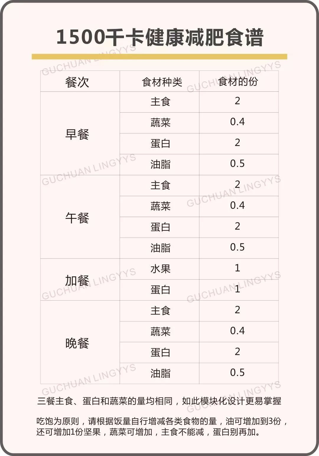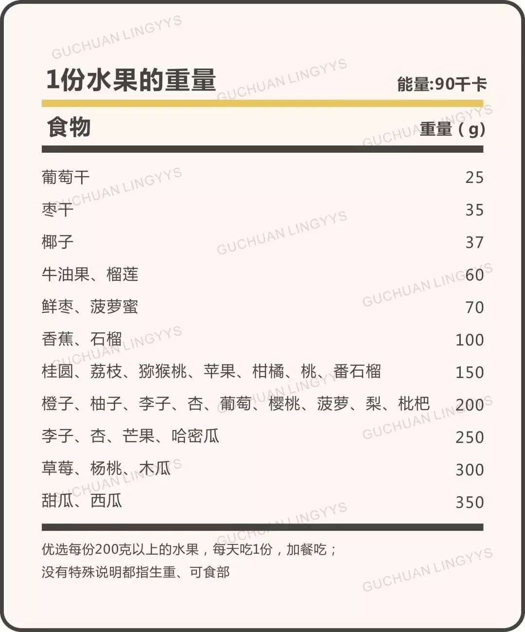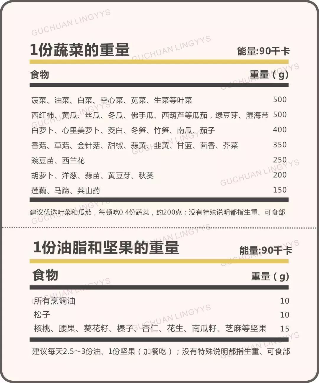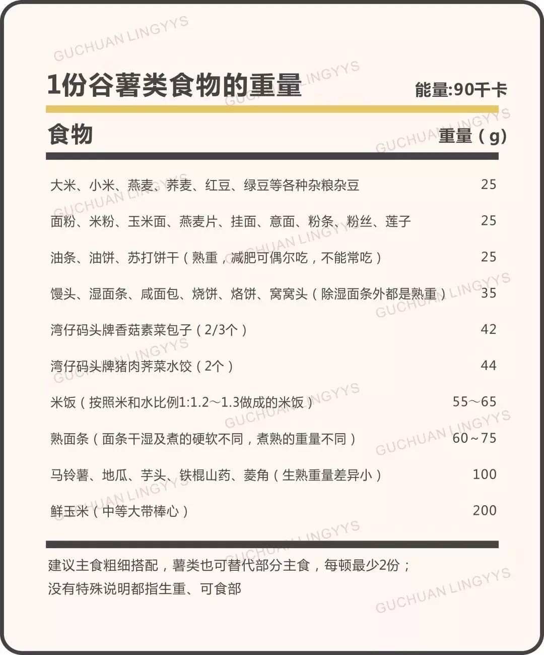 特别说明一下,所有表格中 1 份食物对应的克数都不是最精确的数字,为了方便记忆和操作,专业上都做过四舍五入。