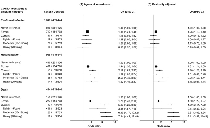 BMJ 上一项研究显示[5],吸烟整体上让新冠感染风险高出了一倍,住院风险升高 5 倍,死亡风险升高 10 倍。