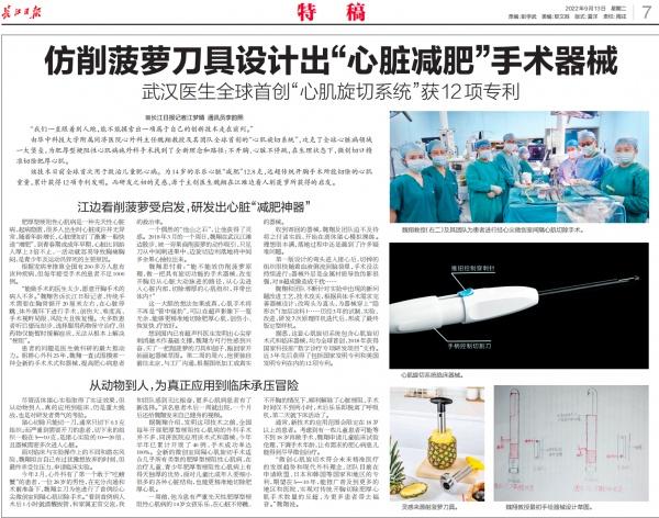 患者治疗效果如何?真有这么神奇吗?一开始,小钱有些怀疑。循着视频内容检索媒体报道,看到了长江日报去年9月的一则报道《仿削菠萝刀具设计出“心脏减肥”手术器械,武汉医生全球首创“心肌旋切系统”获12项专利》,报道中详细写到魏翔教授受削菠萝启发,自主研发了一套心肌旋切器械,历经3年的试制、实验、改进,研发7次原理样机迭代后,形成了最终版定型样机。魏翔教授还通过直播向国内同行分享了治疗肥厚型梗阻性心肌病的全新理念和路径。