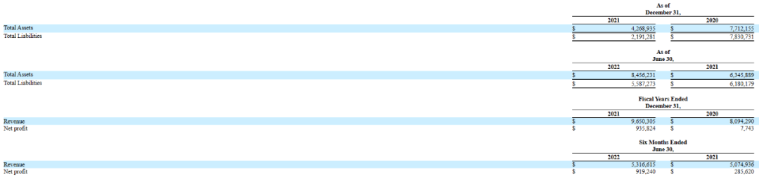在2020财年, 2021财年及2022年前6个月公司营收分别为809.43万美元, 965.03万美元和 531.66万美元,对应的净利润分别为7743美元,93.58万美元,91.92万美元。