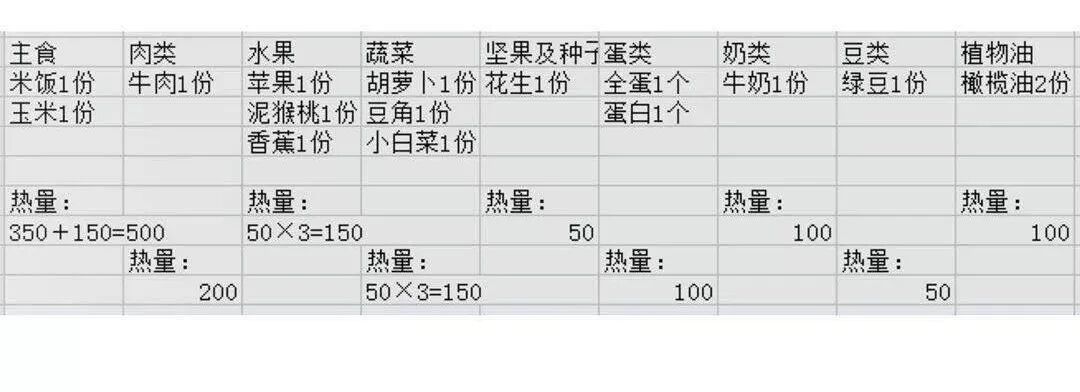 三份50千卡的水果,就350千卡了,我们在选择一份肉类,是200大卡。