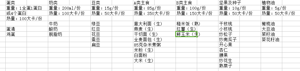 比如我们必须知道100g的牛肉有多少热量,100g苹果有多少热量,5g油有多少热量,还是太麻烦,下面我制作了一份快速选择当日食物的表格。