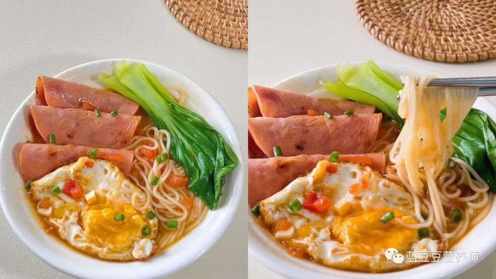 藜麦面、青菜、番茄、火腿、鸡蛋、蒜末、葱花、青菜、胡萝卜丁。
