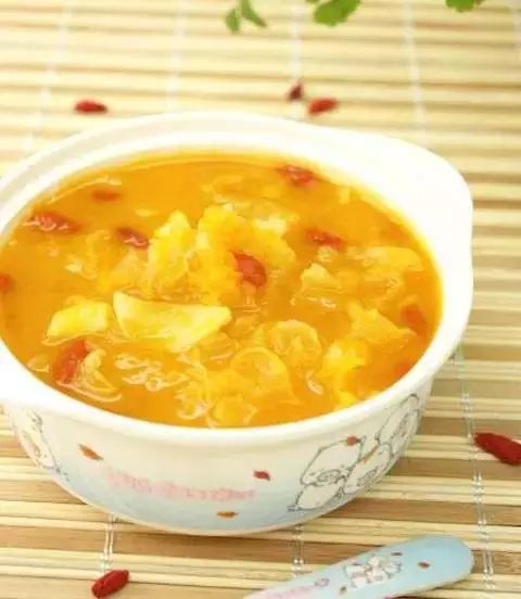 3.放人南瓜丁和撕成小块的银耳保持小火继续煮15分钟最后放人枸杞再煮5分钟即可。