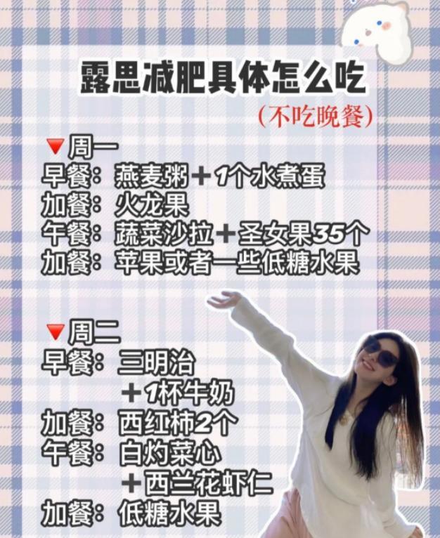 让我们看看她这一周的食谱,星期一和星期二的三餐都不一样,但是小编几乎看不到什么主食,也看不到什么米饭。