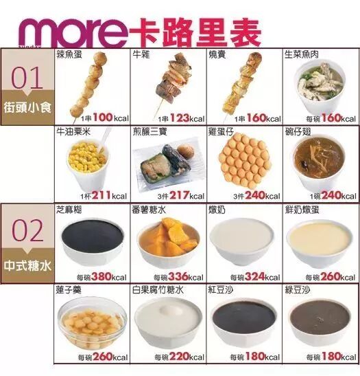 我们再看看一些常见食物的热量。随便几个街头小吃或者一两块甜点就是500大卡的热量。