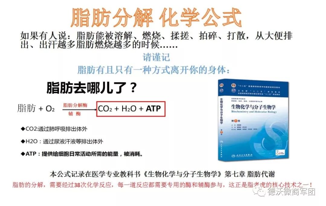 请记住,脂肪的分解公式(参考医学专业大学本科书籍,生物化学与分子生物学)脂肪的分解需要在氧气+酶和辅酶的参与下,分解成水,二氧化碳和ATP。